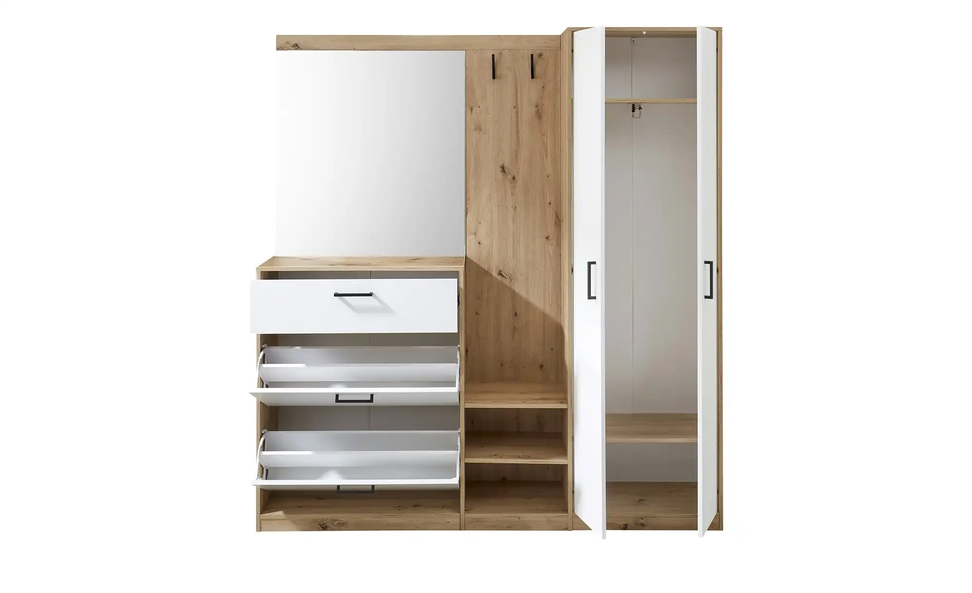 - Inklusive Spiegel, Paneel, Schuhkommode und Schrank