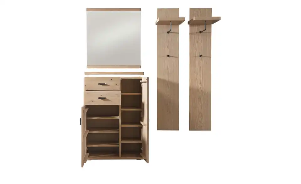 - Mehr zu MaterialKorpus Spanplatte furniert (Eiche)Front, Blenden Massivholz (Balkeneiche)Paneele inkl. Hutablagen Spanplatte furniert (Eiche)Spiegel Trägerplatte: Spanplatte furniert (Eiche)Kleiderstangen, Haken Metall pulverbeschichtet
