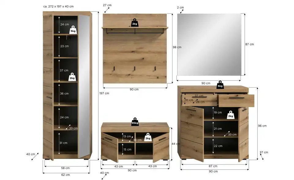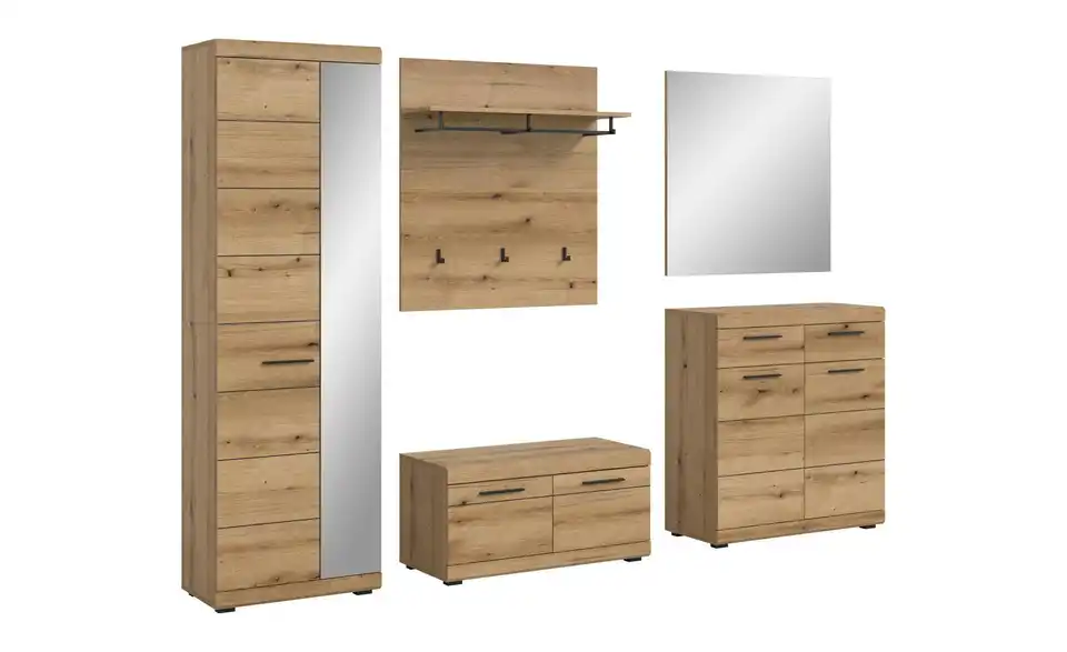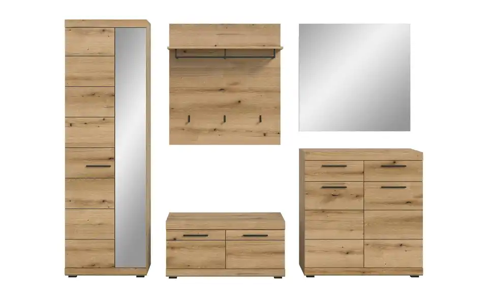 - Lieferumfang / mitgeliefertes Zubehör1x Garderobenschrank, 1x Sitzbank, 1x Paneel, 1x Schuhkommode, 1x Spiegel