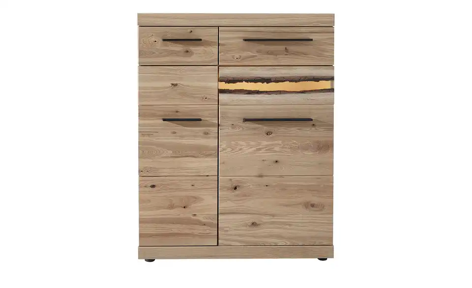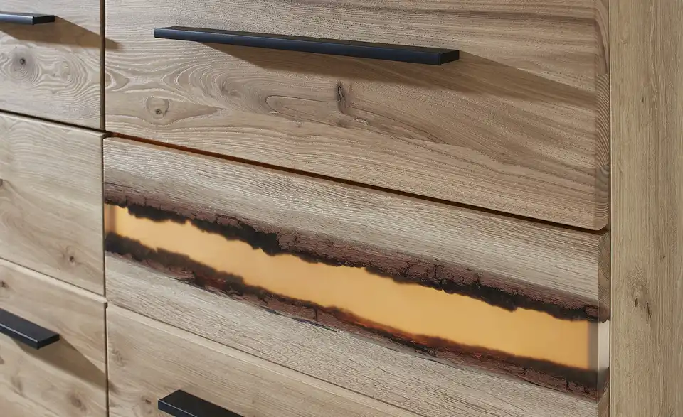 - Mehr zu MaterialFront Massivholz gebürstetAbsetzung Rinde in EpoxidharzGriff Aluminium lackiert