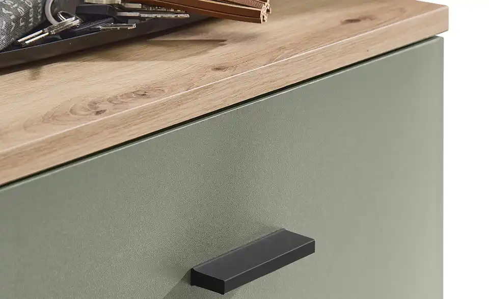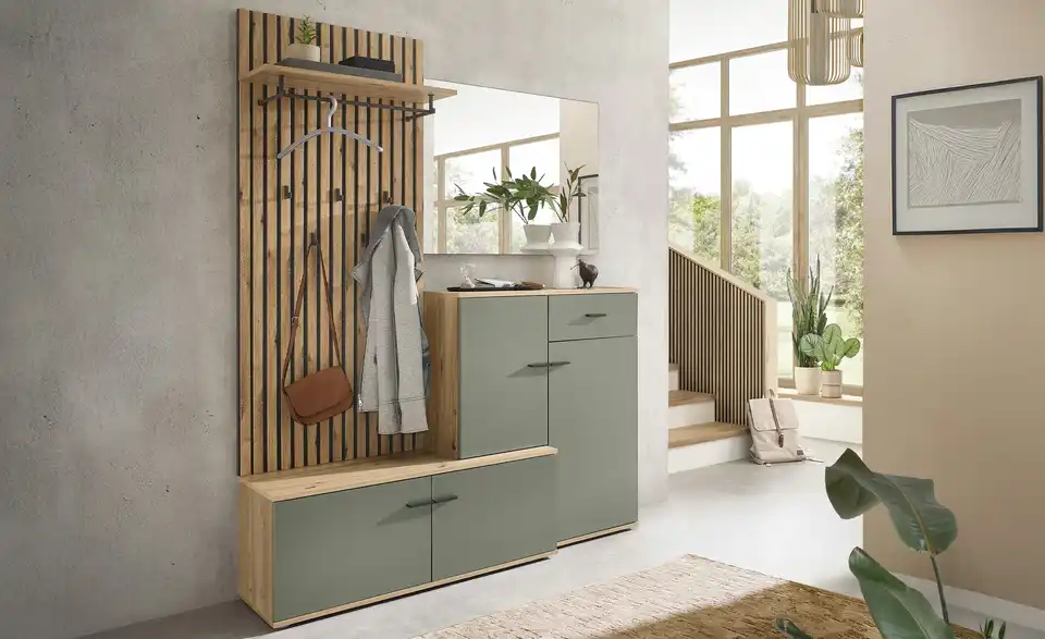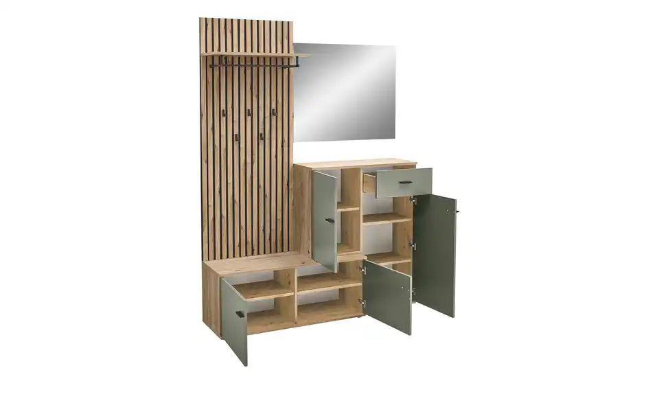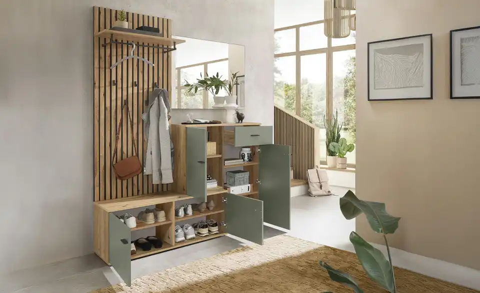 Diese moderne Garderobe überzeugt mit einer stilvollen Kombination aus Asteiche-Optik, weißen Fronten und schwarzen Akzenten. Das Set aus Schrank, Bank und Paneel bietet durchdachten Stauraum und ein zeitloses Design für den Eingangsbereich. Das Paneel in markanter Lamellenoptik ist mit drei Haken und einer Kleiderstange ausgestattet. Im Schrank mit zwei Drehtüren, davon eine Spiegeltür, sorgen sieben Einlegeböden für Platz für bis zu ca. 18 Paar Schuhe. Ideal für einen aufgeräumten, modernen Flur.Lieferung & Versand