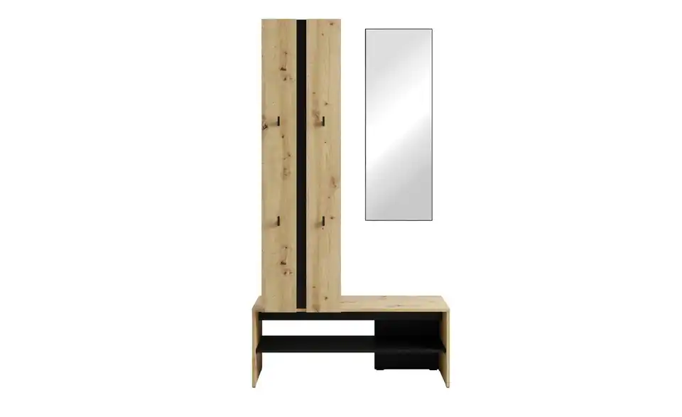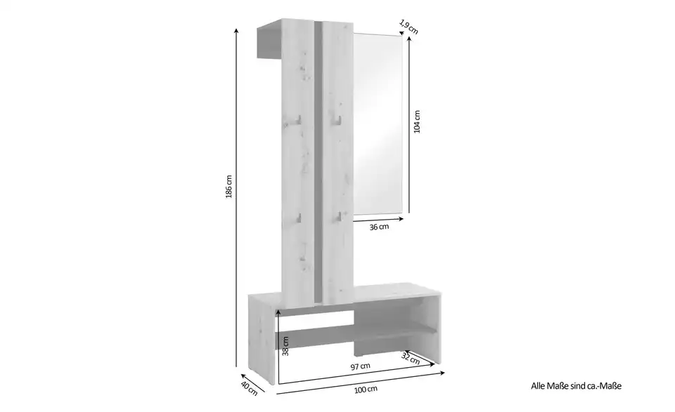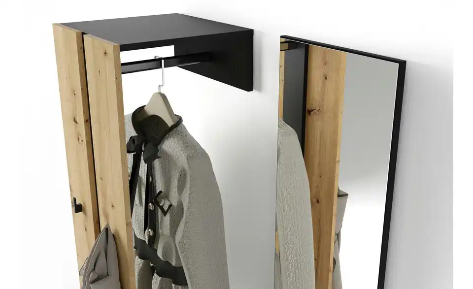 - Mehr zu Ausstattung / FunktionKleiderstange Metall schwarz, Haken Kunststoff schwarz, Spiegelglasstärke 3mm, Einlegeboden in 32mm-Abständen verstellbar