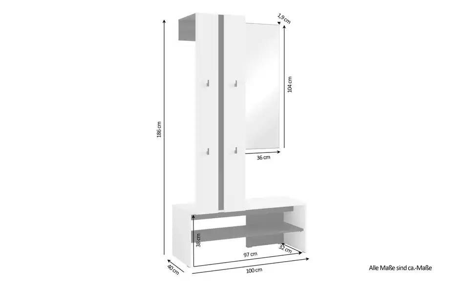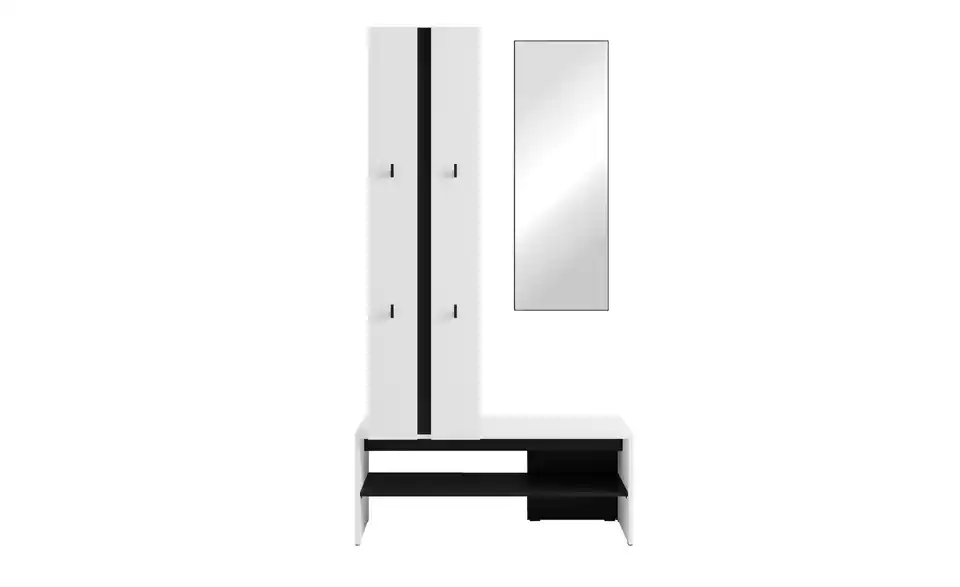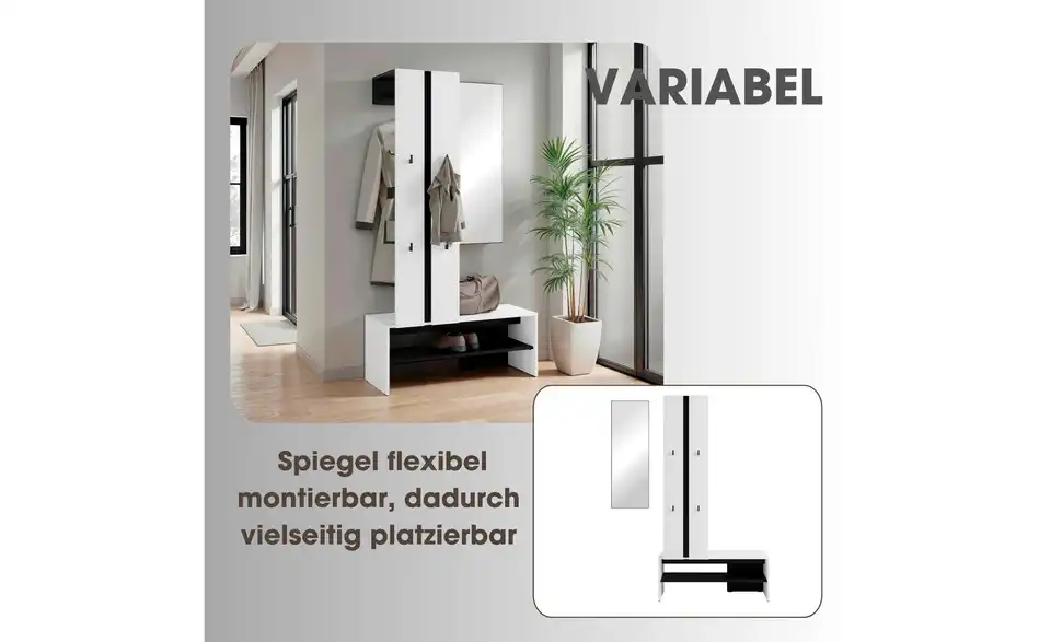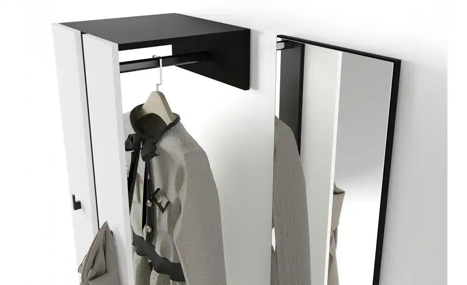 - Mehr zu Ausstattung / FunktionKleiderstange Metall schwarz, Haken Kunststoff schwarz, Spiegelglasstärke 3mm, Einlegeboden in 32mm-Abständen verstellbar