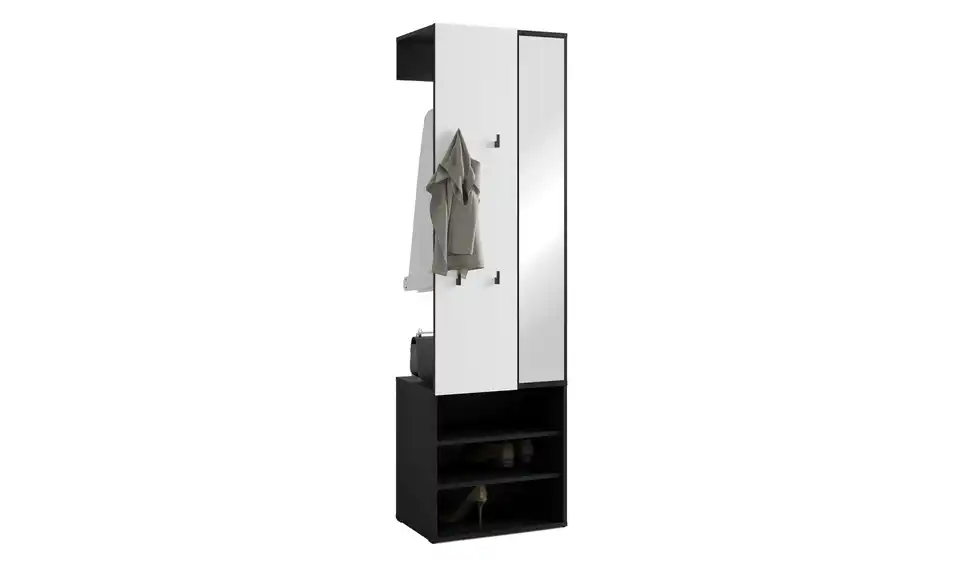 - Mehr zu Ausstattung / FunktionKleiderstange Metall schwarz, Haken Kunststoff schwarz, Spiegelglasstärke 3mm, Einlegeboden in 32mm-Abständen verstellbar, Fächer für max. 6 paar Schuhe geeignet