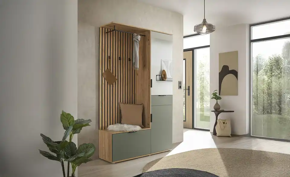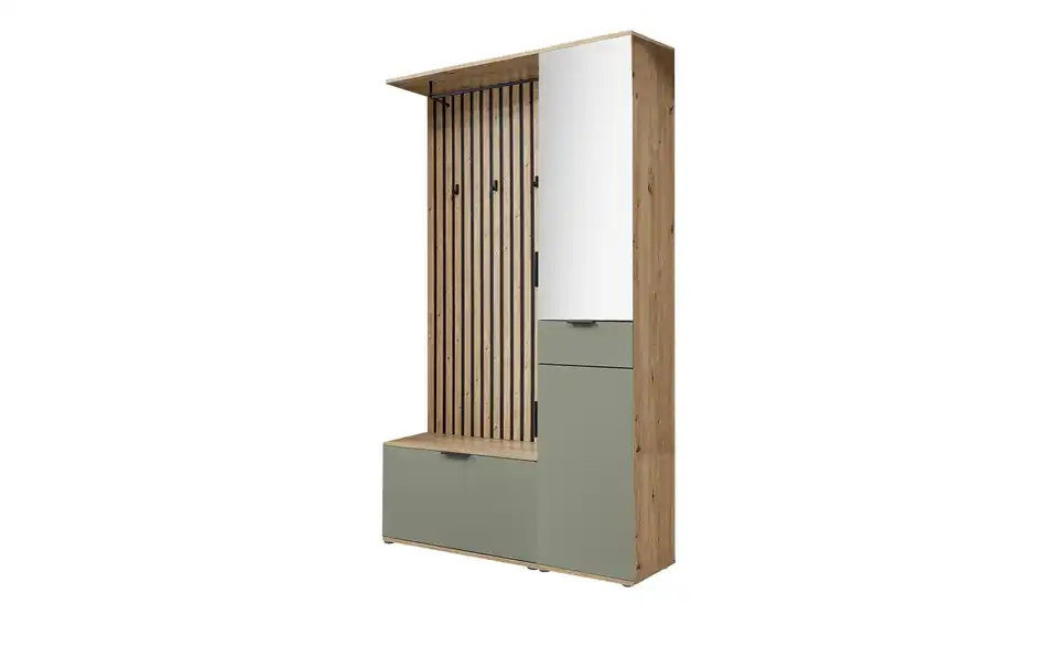 Diese moderne Garderobe überzeugt mit einer stilvollen Kombination aus Asteiche-Optik, weißen Fronten und schwarzen Akzenten. Das Set aus Schrank, Bank und Paneel bietet durchdachten Stauraum und ein zeitloses Design für den Eingangsbereich. Das Paneel in markanter Lamellenoptik ist mit drei Haken und einer Kleiderstange ausgestattet. Im Schrank mit zwei Drehtüren, davon eine Spiegeltür, sorgen sieben Einlegeböden für Platz für bis zu ca. 18 Paar Schuhe. Ideal für einen aufgeräumten, modernen Flur.Lieferung & Versand