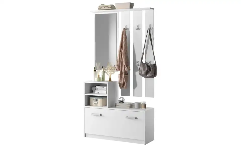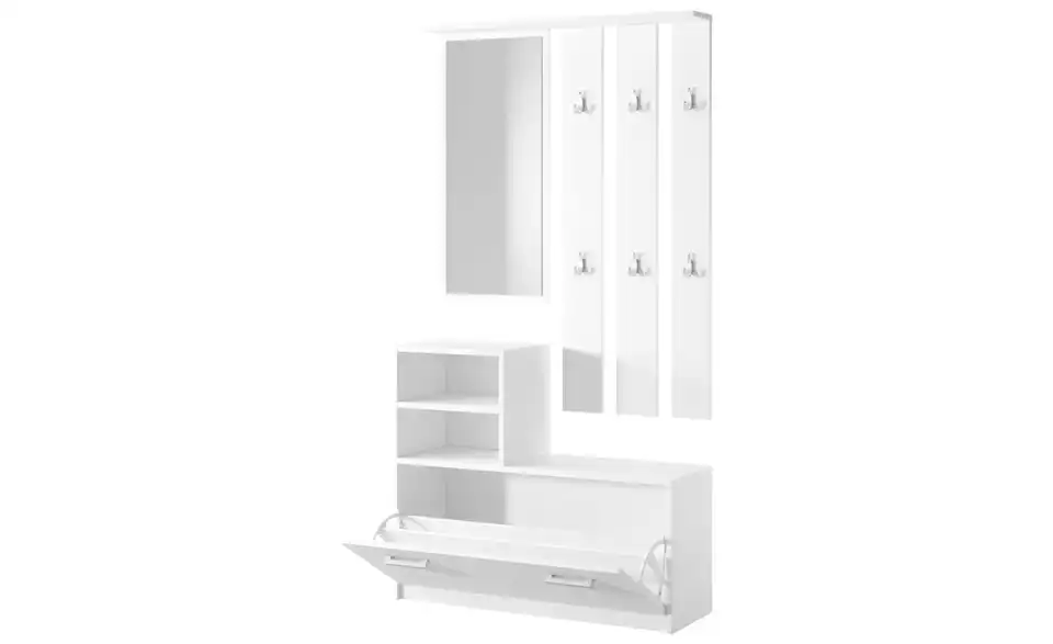 - Lieferumfang / mitgeliefertes Zubehör1 x Spiegel, 1 x Garderobenpaneel, 1 x Regale, 1 x Schuhschrank