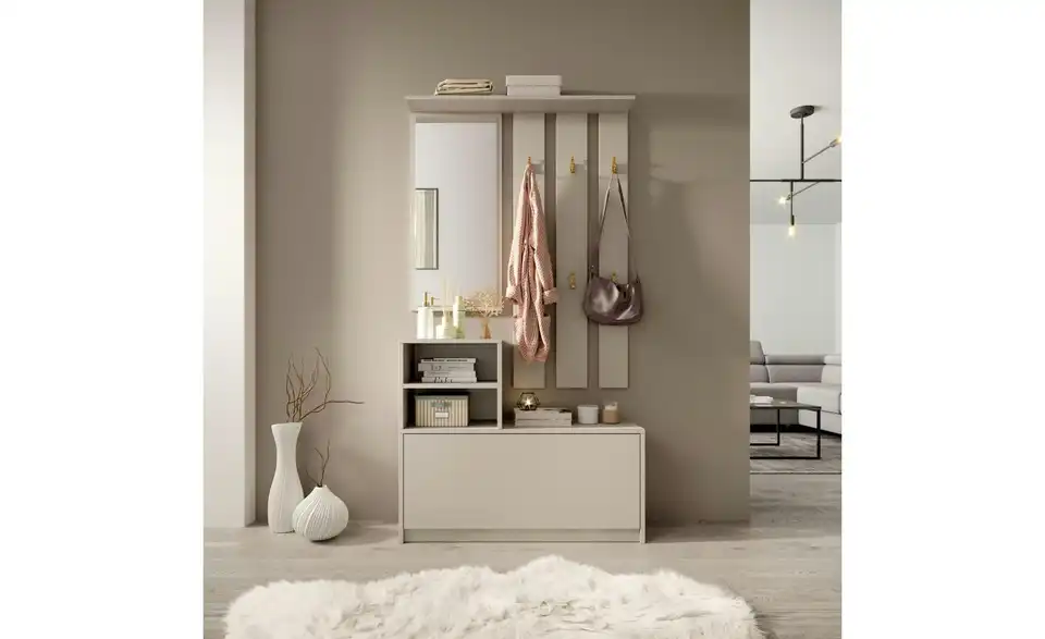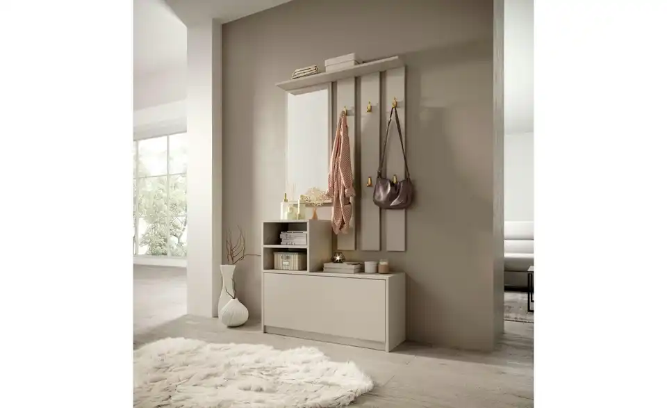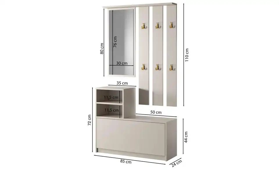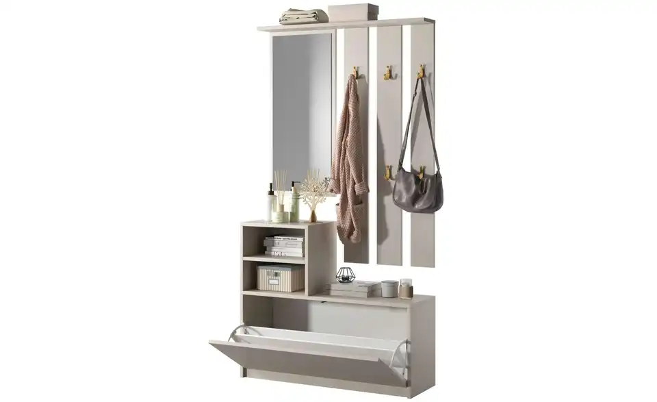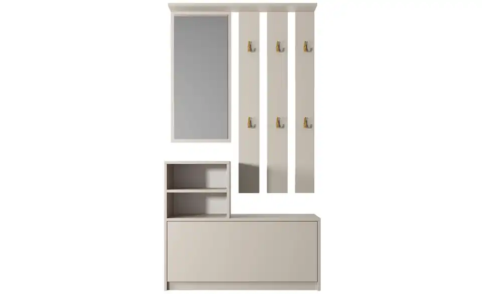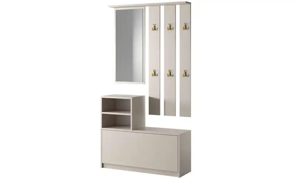 - Lieferumfang / mitgeliefertes Zubehör1 x Spiegel, 1 x Garderobenpaneel, 1 x Regale, 1 x Schuhschrank