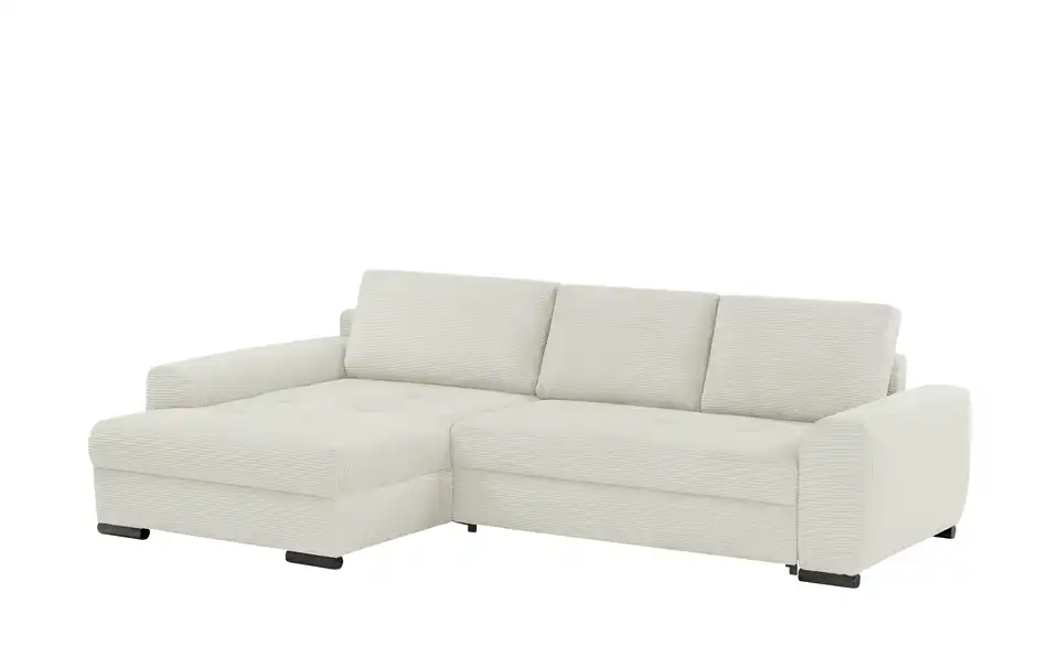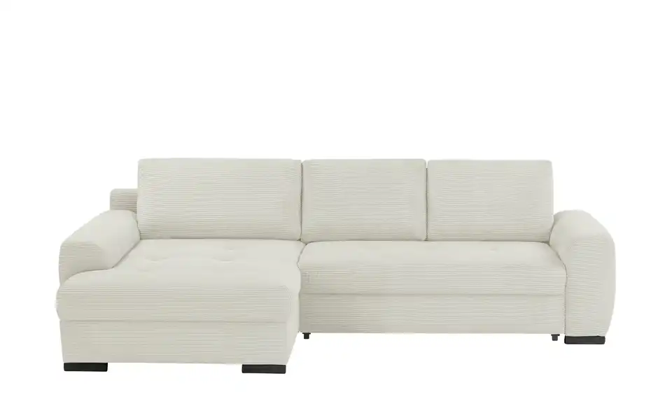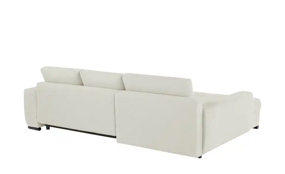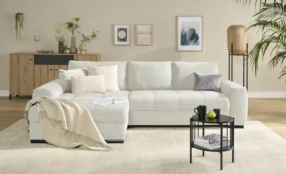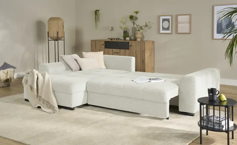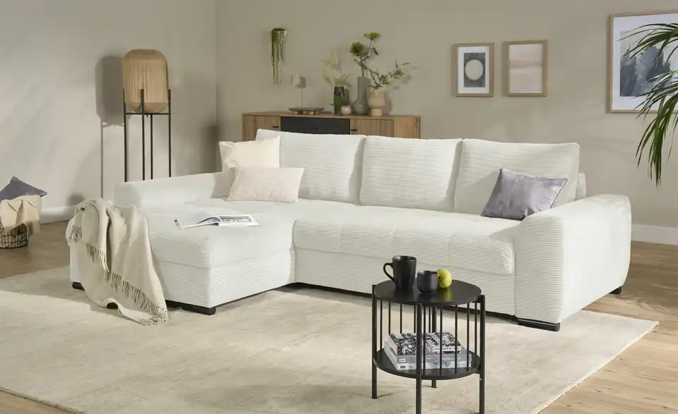 Es lässt sich auf diesem Ecksofa komfortabel entspannen oder sitzen. Der Markenartikel von bobb hat eine Polsterung aus Schaumstoff. Der Rücken des Sofas ist echt bezogen, sodass es ohne Probleme mitten im Raum aufgestellt werden kann. Das Gestell aus Metall ist das Fundament des Polstermöbels. Dank eines im Lieferumfang enthaltenen Bettkastens sind Decken und Kissen stets zur Hand. Um Rückenkissen brauchen Sie sich keine Gedanken mehr zu machen, denn diese liegen dem Modell Soumia bereits bei. Das Stellmaß ist 283 x 91 x 181 cm. Mit diesem Sofa richten Sie Ihre vier Wände behaglich ein.Lieferung & Versand