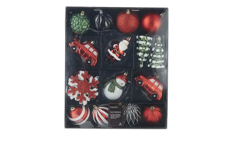 - Mehr zu Ausstattung / Funktionbestehend aus Weihnachtskugeln und Anhänger (Auto, Schneemann, Schneeflocken, Tanne, Weihnachtsmann)