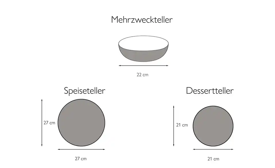- Lieferumfang / mitgeliefertes Zubehör4 Speiseteller 27 cm 4 Dessertteller 21 cm 4 Mehrzweckteller tief 22 cm