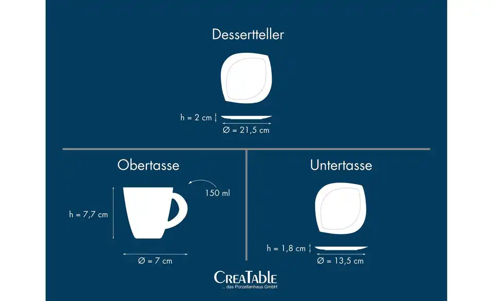 - Lieferumfang / mitgeliefertes Zubehör6 Dessertteller 22 cm 6 Obertassen 15 cl 6 Untere 15 cm