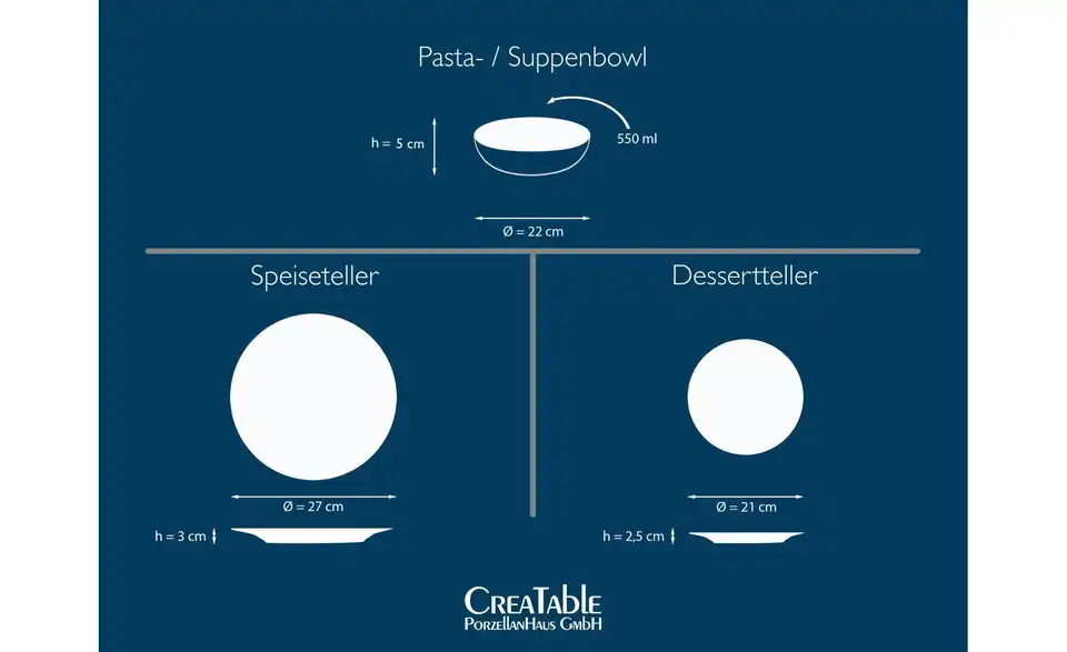 - Lieferumfang / mitgeliefertes Zubehör4 Speiseteller 27 cm 4 Pasta- / Salat- / Suppenteller 22 cm 4 Dessertteller 21 cm