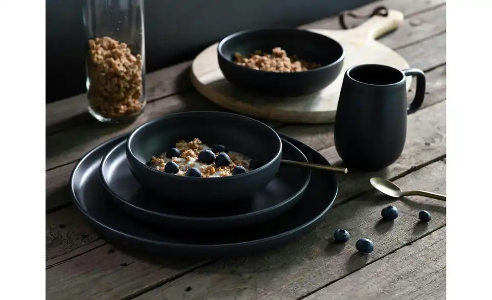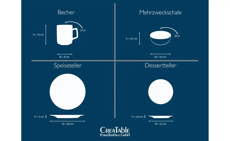 - Lieferumfang / mitgeliefertes Zubehör4 Speiseteller 28 cm 4 Dessertteller 21 cm 4 Mehrzweckschale 16 cm 4 Kaffeebecher 37 cl