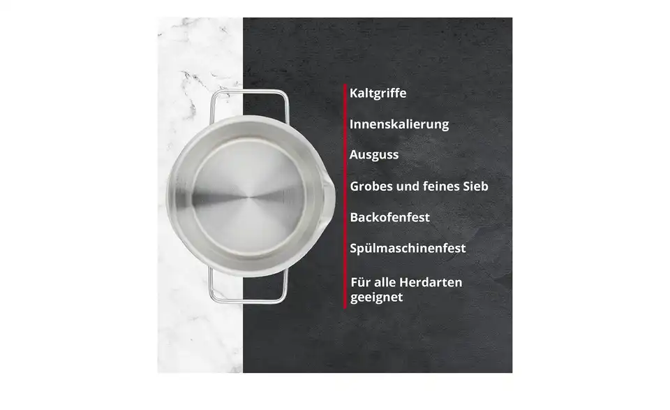 Auf den ersten Blick fällt die namensgebende konische Form bei den Kochtöpfen Konus auf. Darüber hinaus überzeugen diese noch viel mehr mit aller Hand praktischer Vorteile: Zuerst befindet sich im Inneren eine Skala, somit müssen Sie kein Wasser vorher extra abmessen. Des weiteren sind die Griffe Innen "hohl", also mit Luft gefüllt und diese isoliert gut. Dadurch werden die Griffe erst nach sehr langer Zeit heiß, dass heißt diese bleiben länger kühl und anfassbar. Zum Schluss hat der Topf eine Ausgusslippe und im Deckel befinden sich ein grobes und feines Sieb zum abgießen. Ein Topf der alles kann!Lieferung & Versand