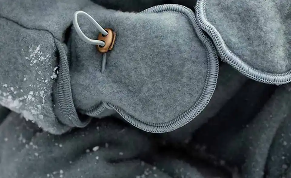 - Mit Kinnschutz, Kapuze und Umschlagbündchen an Händen und Füßen
