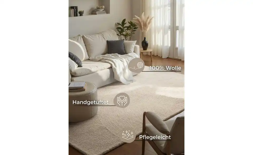 - Materialzusammensetzung TextilVorderseite 100% Wolle, Rückseite: 100% Recycelte Baumwolle
