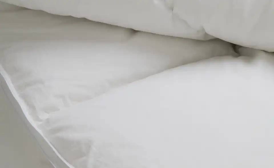 - Materialzusammensetzung TextilBezug Mako-Einschütte (100% Baumwolle) mit Klimaband und Außensteg ca. 3cmFüllung Daunen (90%) u. Federn (10%)