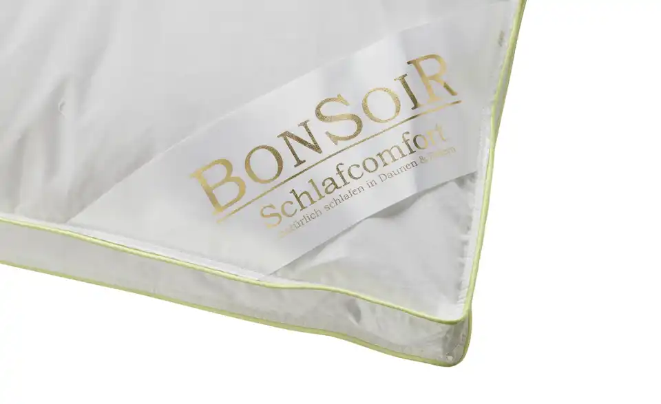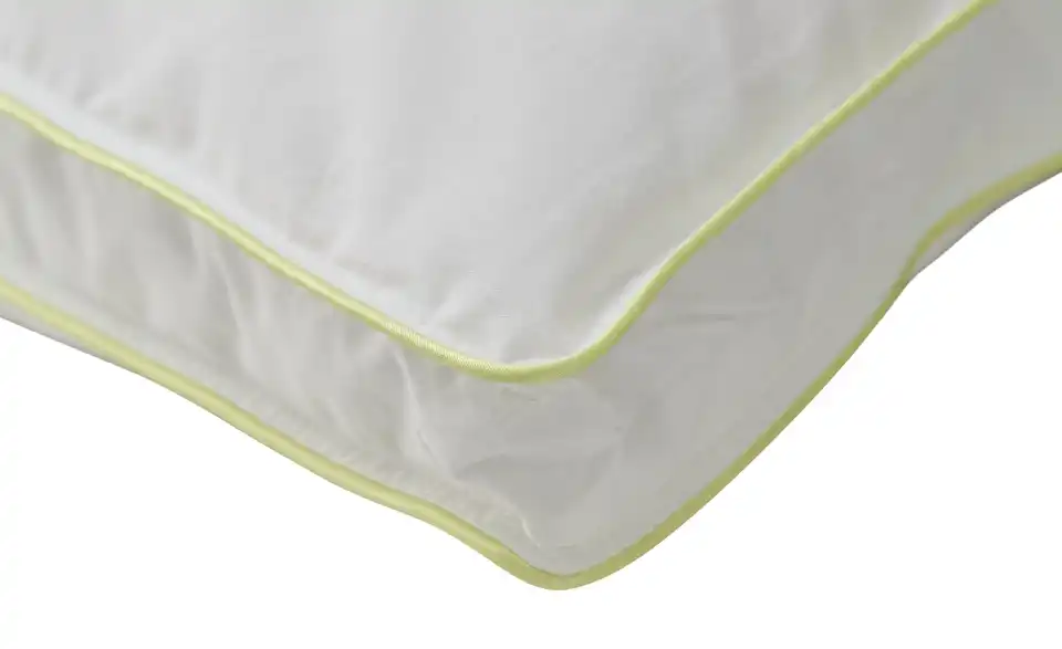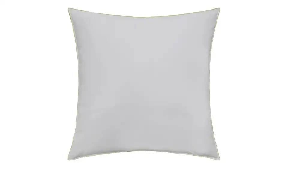 - Materialzusammensetzung TextilBezug Mako-Feinköper (100% Baumwolle) mit ca. 4cm Außensteg u. mit doppelter chartreusefarbener SatinbieseFüllung Außenkammern je Daunen (50%) u. Federn (50%) / Innenkammer Federn (100%)
