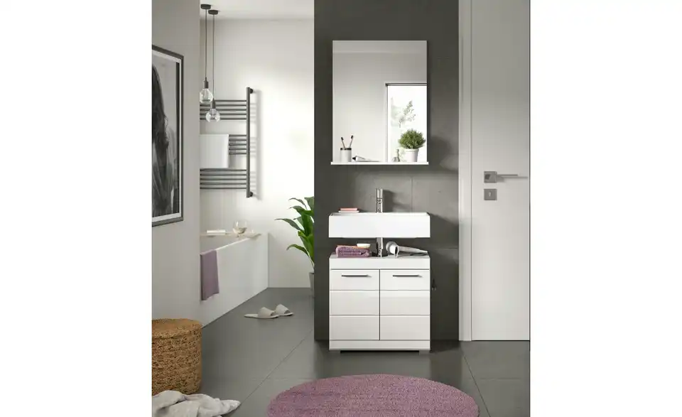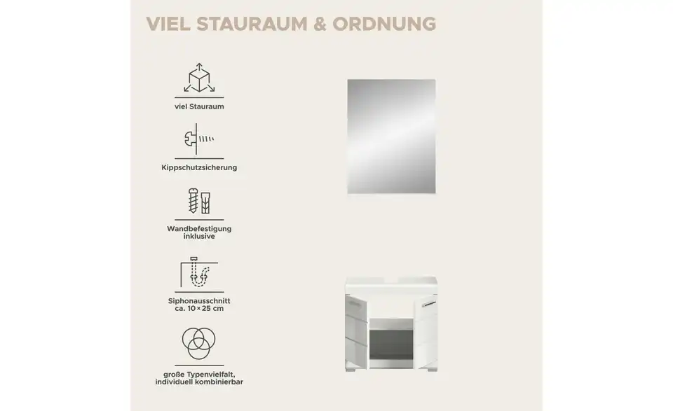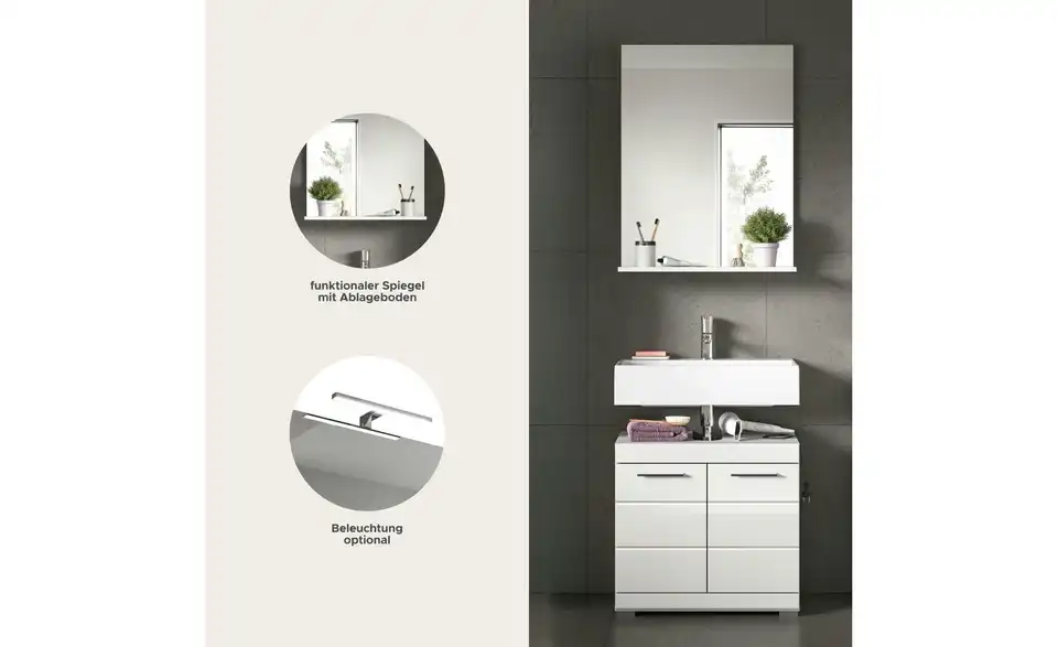 - Lieferumfang / mitgeliefertes ZubehörWaschbeckenunterschrank (B/H/T ca. in cm 60/56/34), Spiegel (B/H/T ca. in cm: 60/79/18)