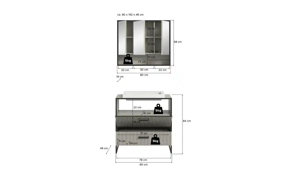 - Bestehend aus1x Spiegelschrank, 1 Waschtisch inkl. Waschbecken