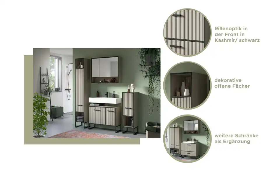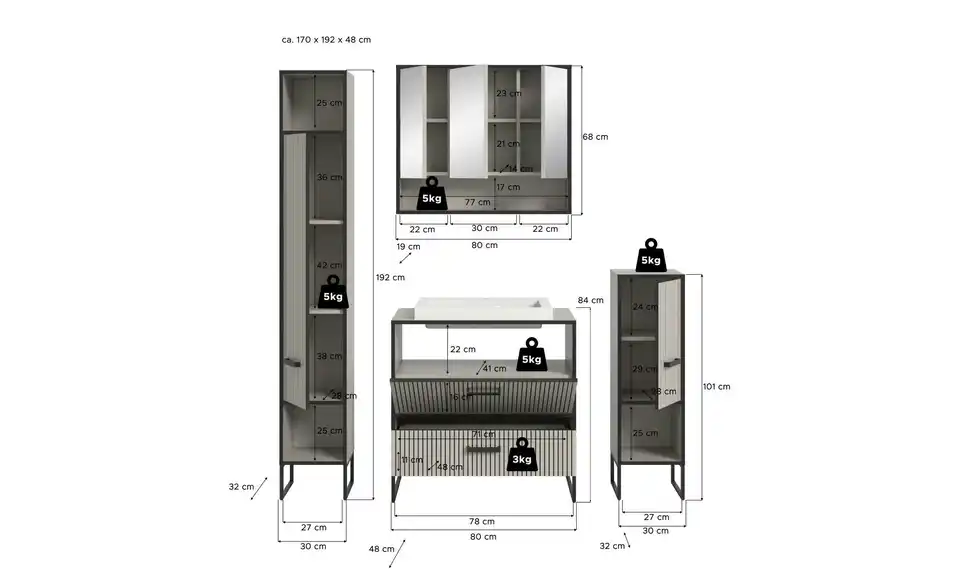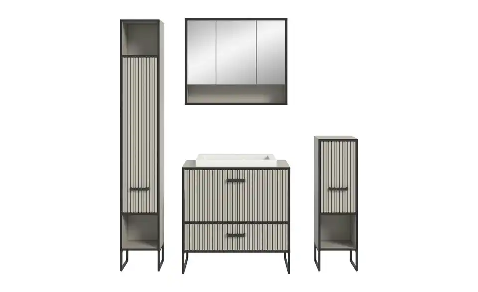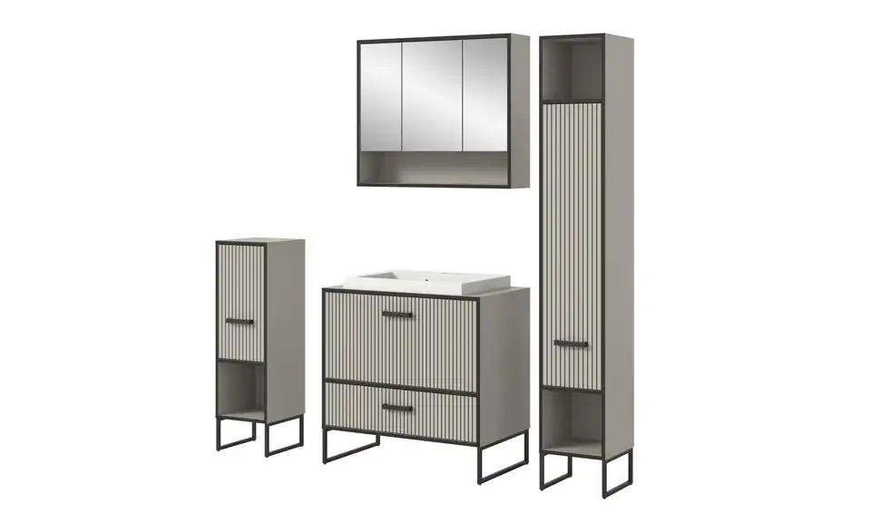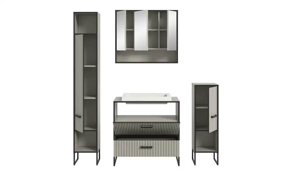 - Bestehend aus1x Hochschrank, 1x Spiegelschrank, 1x Standschrank, 1x Waschtisch inkl. Waschbecken