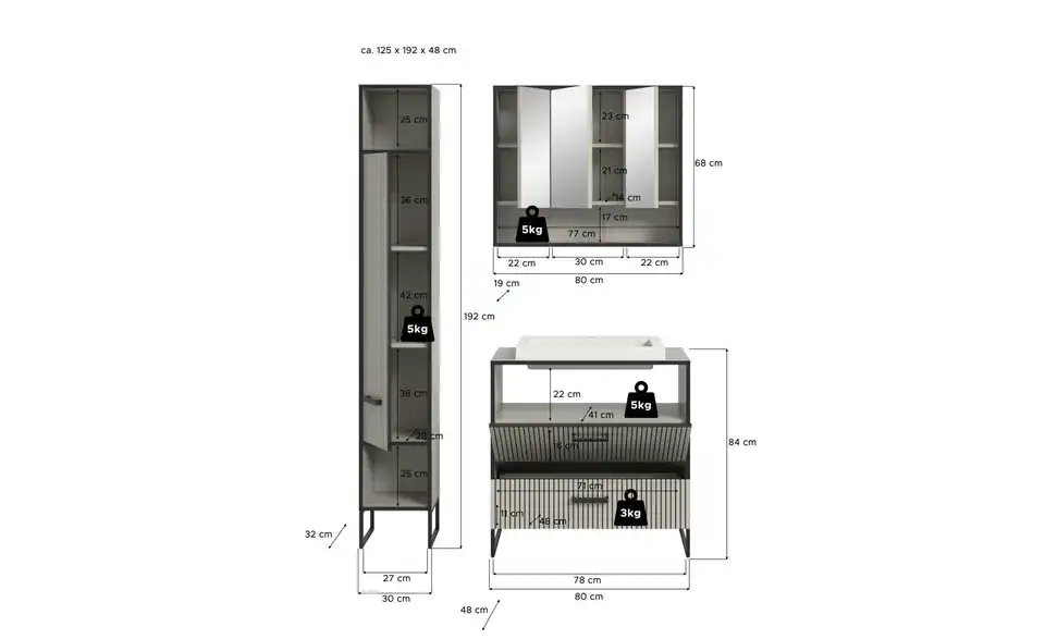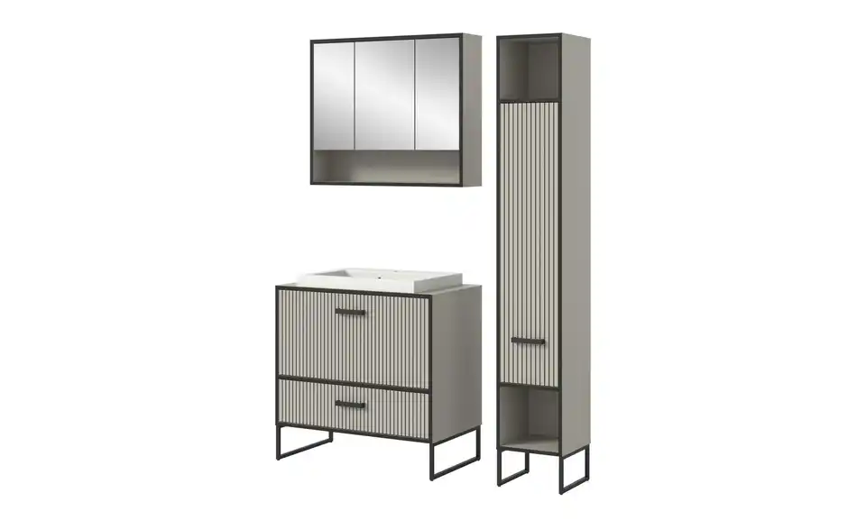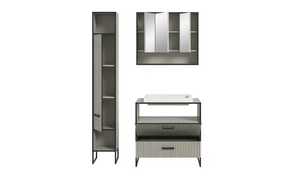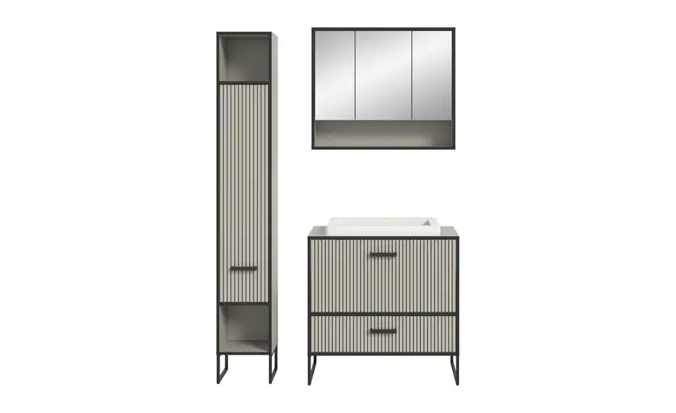 - Bestehend aus1x Hochschrank, 1x Spiegelschrank, 1x Waschtisch inkl. Waschbecken