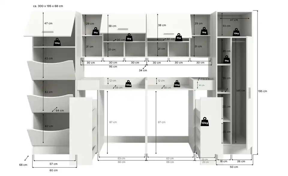 - Bestehend aus1x Wäscheschrank, 2x Waschmaschinenumbau, 2x Hängeschrank, 2x Anstellregal, 1x Universalschrank