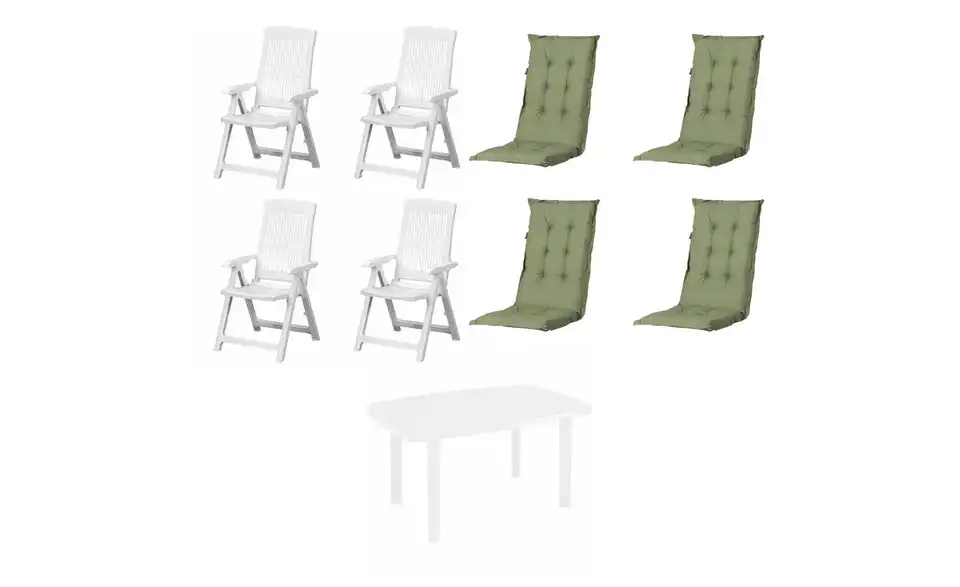- Lieferumfang / mitgeliefertes Zubehör4 x Klappsessel weiß, 1 x Tisch weiß,, 4 x Auflage grün