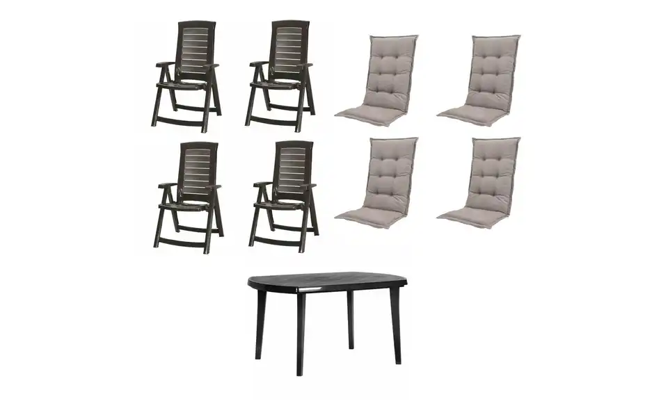 - Lieferumfang / mitgeliefertes Zubehör4 x Klappsessel graphit, 1 x Tisch graphit, 4 x Auflage taupe