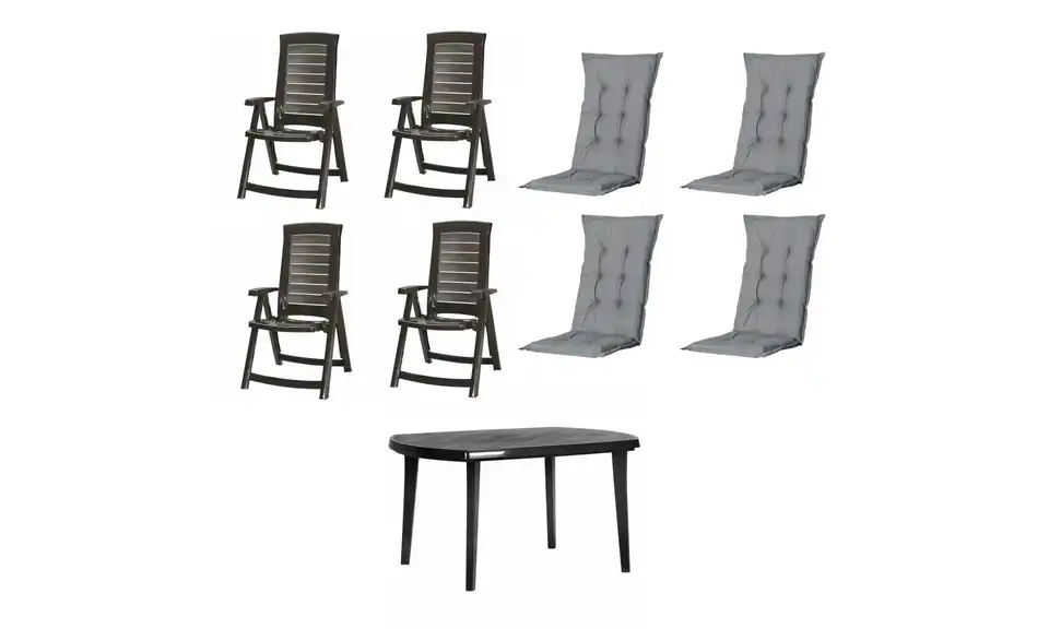 - Lieferumfang / mitgeliefertes Zubehör4 x Klappsessel graphit, 1 x Tisch graphit, 4 x Auflage grau