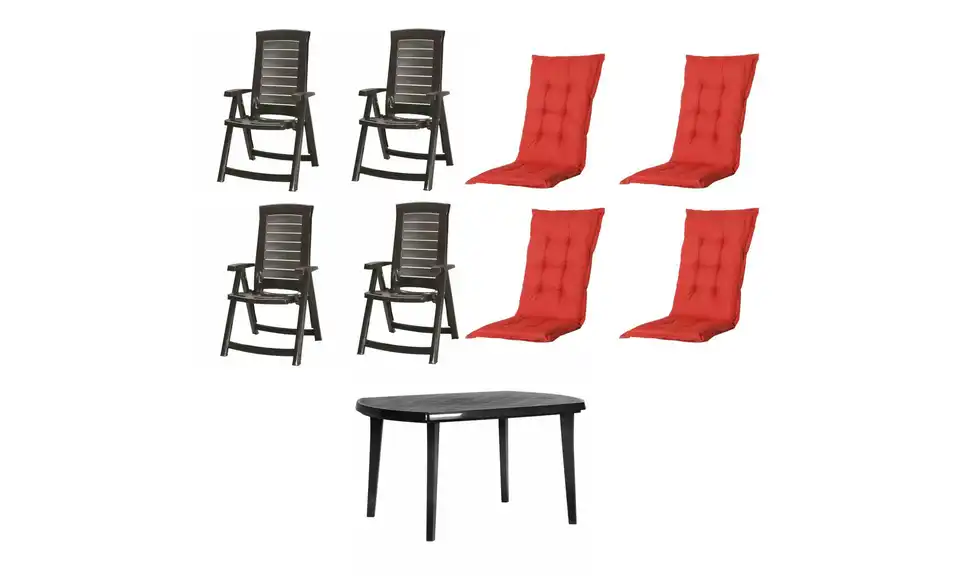 - Lieferumfang / mitgeliefertes Zubehör4 x Klappsessel graphit, 1 x Tisch graphit,, 4 x Auflage red