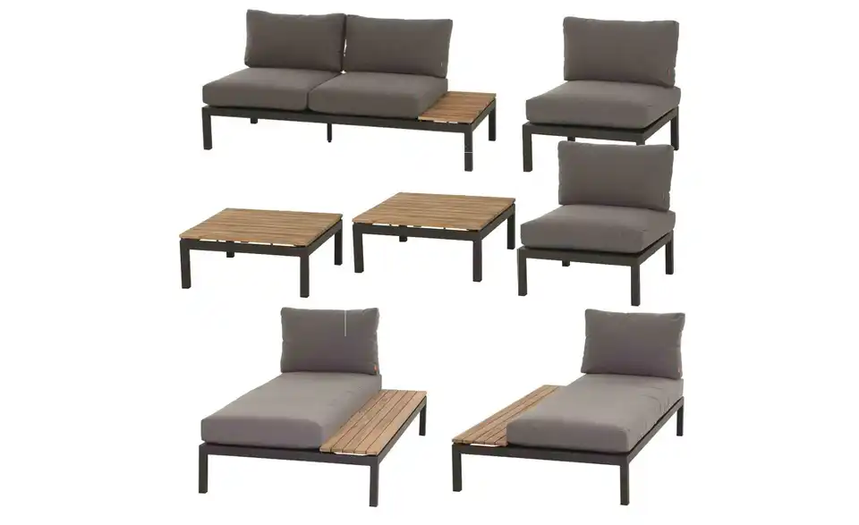 - Lieferumfang / mitgeliefertes Zubehör1x Bank links, 2x Modul Mitte, 1x Recamiere links, 1x Recamiere rechts, 2x Loungetisch