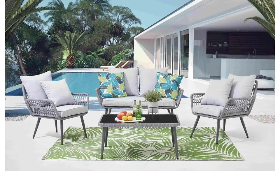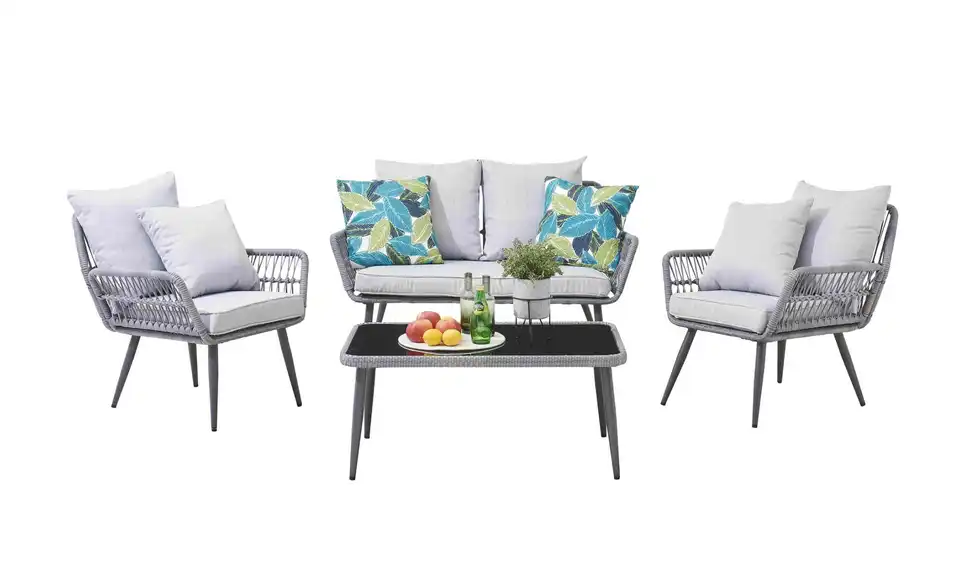 - Lieferumfang / mitgeliefertes Zubehör2 Stühle, 1 Bank, 1 Couchtisch, inklusive Sitz- und Rückenkissen