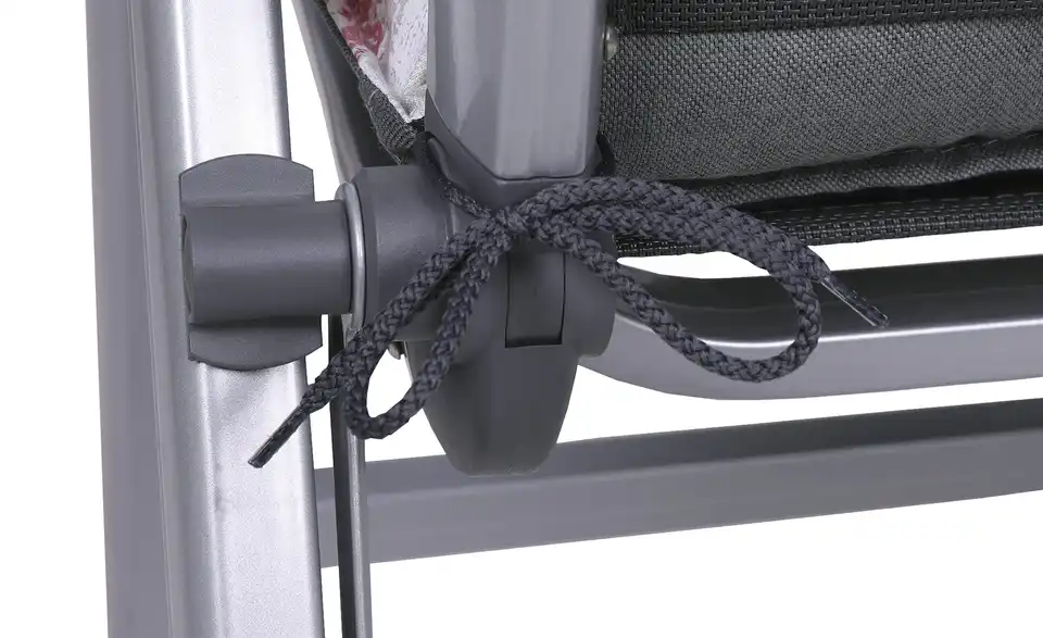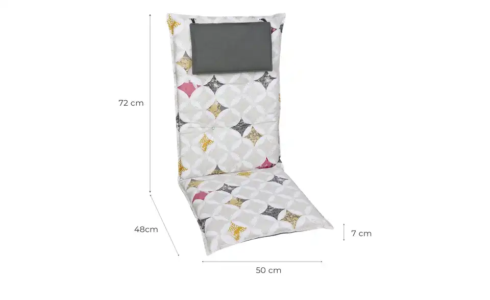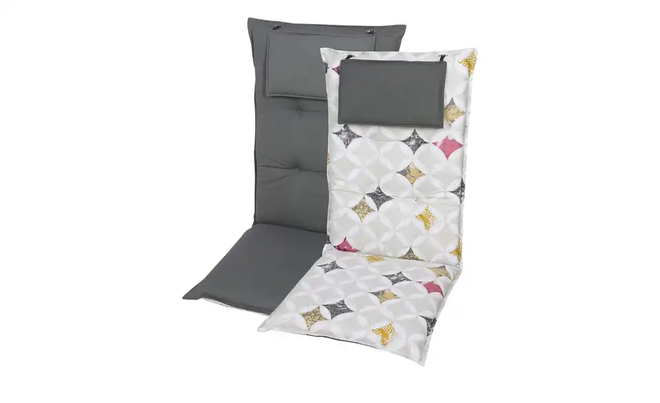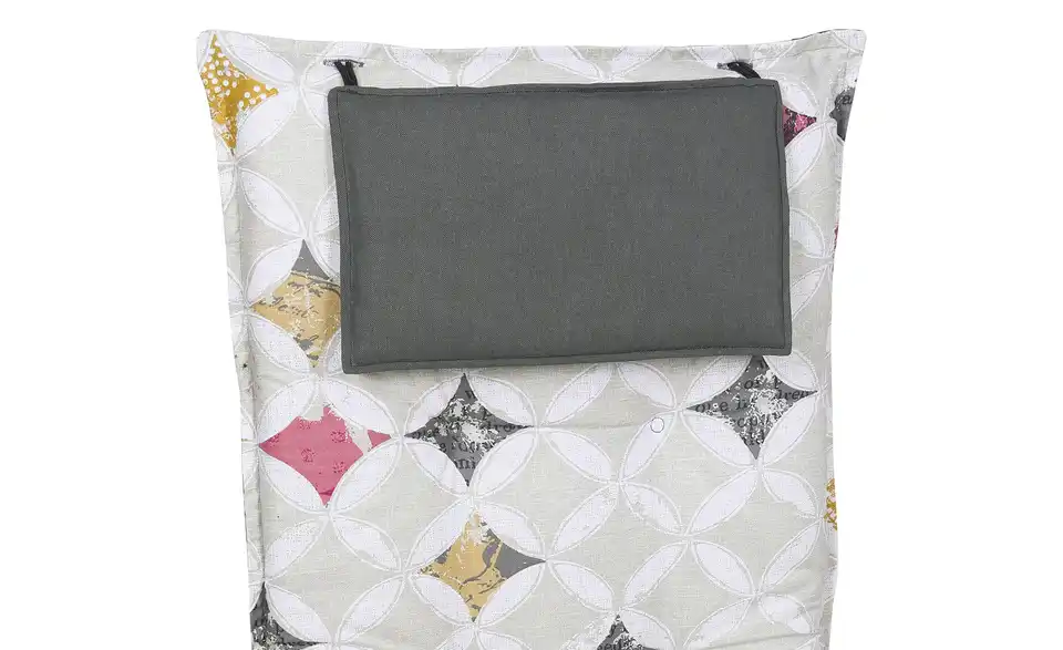 - Mehr zu AusführungWendeauflage mit Stehsaum und integriertem Kopfpolster, verstellbares Gurtband im Rücken, seitliche Bindekordeln und Kreissteppung im Lehnenrücken