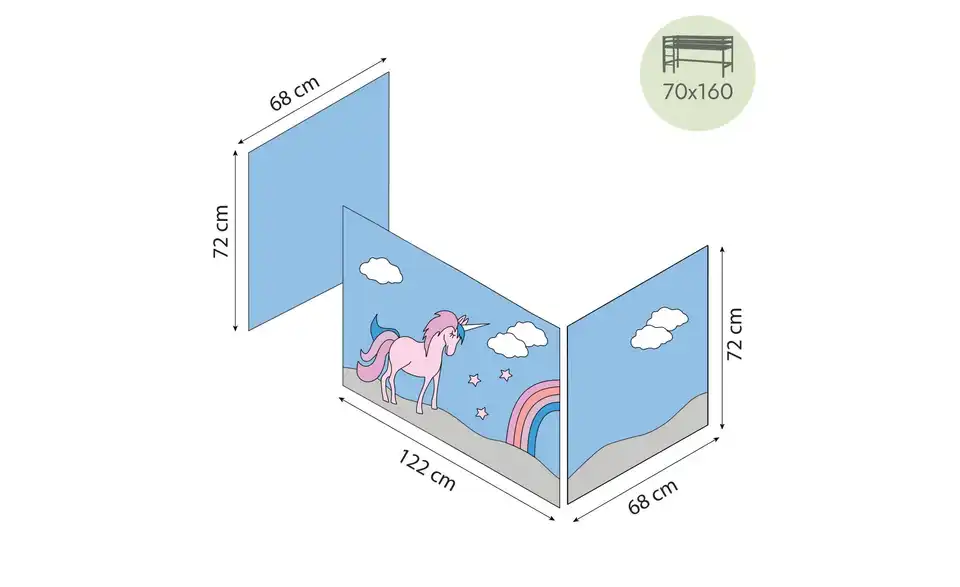 - Für Kinderbetten mit Liegefläche 70x160 und Höhe unter dem Bett ca. 70 cm
