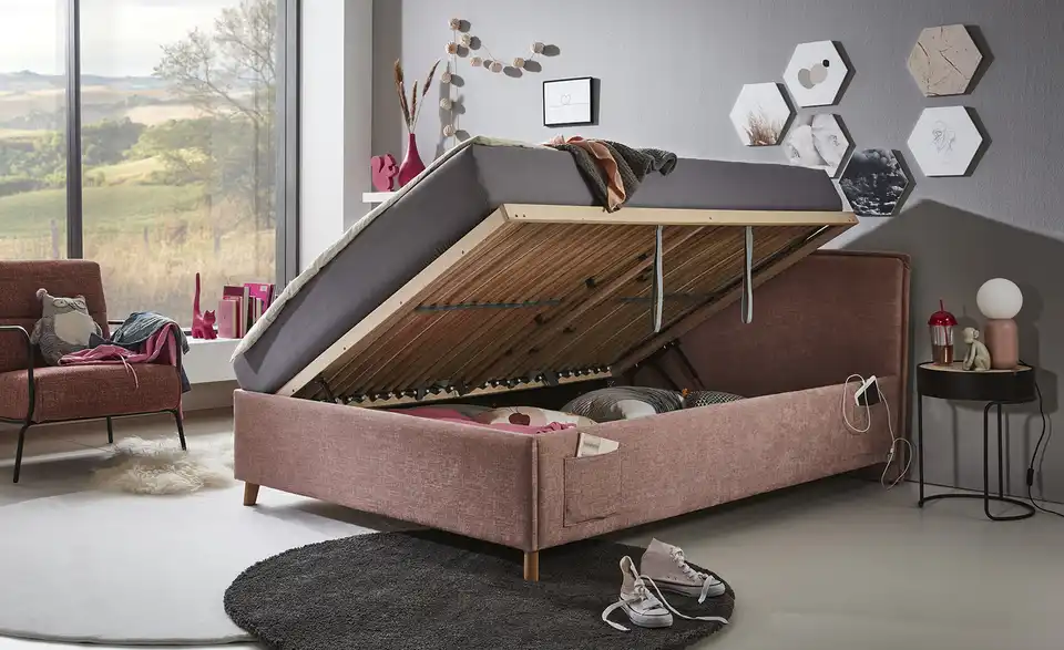 - Zwei stylische Seitentaschen am Bett für Handy, Tablet oder Bücher