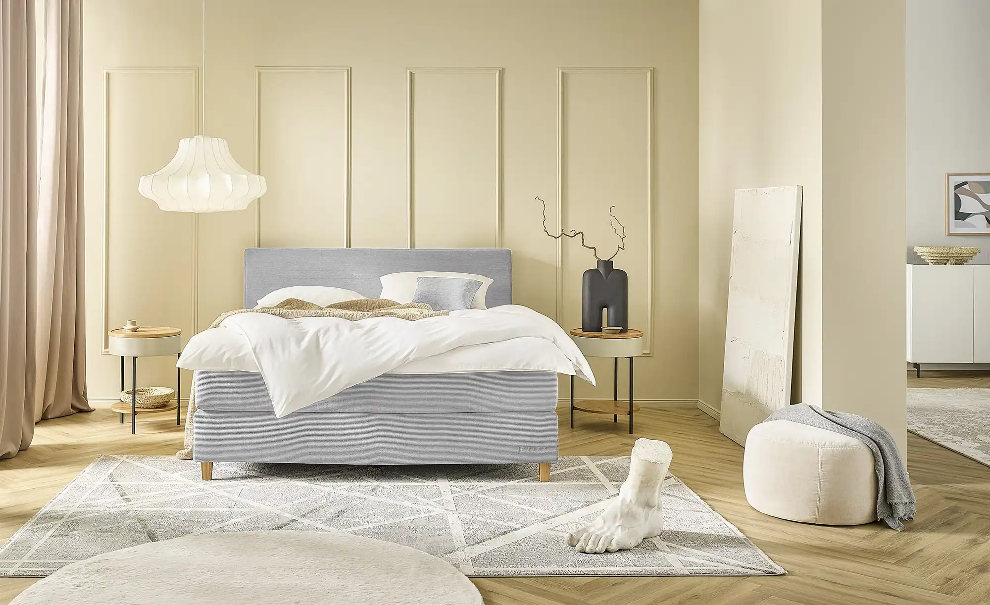 Minimalistisch und dadurch kombinationsfreudig: Das Boxspringbett Jette Flex passt in diverse Einrichtungskonzepte. Der geriffelte, weiche Cordbezug und die Eichen-Massivholzfüße sind dabei gekonnt aufeinander abgestimmt und sorgen für ein harmonisches Gesamtbild. Dank der Kombination aus Bonnellfederkernen in der Box und den Tonnentaschenfederkernen in der Matratze wird das Bett auch höchsten Komfortansprüchen mühelos gerecht. Der mitgelieferte Topper rundet Dein Schlaferlebnis dabei zusätzlich ab. Wähle nur noch Deinen bevorzugten Matratzenhärtegrad und entscheide Dich für deine favorisierte Topper-Art: Schon hast Du Deine ganz persönliche Schlaf-Oase erschaffen. Unser Tipp: Ergänze das Boxspringbett mit der Bettbank Jette Flex, um eine Sitzgelegenheit im Schlafzimmer zu schaffen. Und praktischen Stauraum für Bettwäsche und Co bietet sie auch.Lieferung & Versand