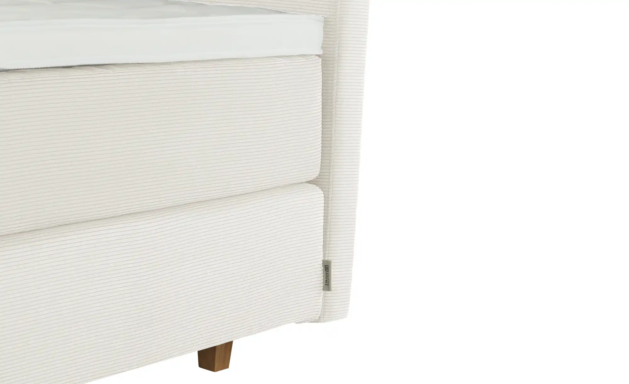 Minimalistisch und dadurch kombinationsfreudig: Das Boxspringbett Jette Flex passt in diverse Einrichtungskonzepte. Der geriffelte, weiche Cordbezug und die Eichen-Massivholzfüße sind dabei gekonnt aufeinander abgestimmt und sorgen für ein harmonisches Gesamtbild. Dank der Kombination aus Bonnellfederkernen in der Box und den Tonnentaschenfederkernen in der Matratze wird das Bett auch höchsten Komfortansprüchen mühelos gerecht. Der mitgelieferte Topper rundet Dein Schlaferlebnis dabei zusätzlich ab. Wähle nur noch Deinen bevorzugten Matratzenhärtegrad und entscheide Dich für deine favorisierte Topper-Art: Schon hast Du Deine ganz persönliche Schlaf-Oase erschaffen. Unser Tipp: Ergänze das Boxspringbett mit der Bettbank Jette Flex, um eine Sitzgelegenheit im Schlafzimmer zu schaffen. Und praktischen Stauraum für Bettwäsche und Co bietet sie auch.Lieferung & Versand