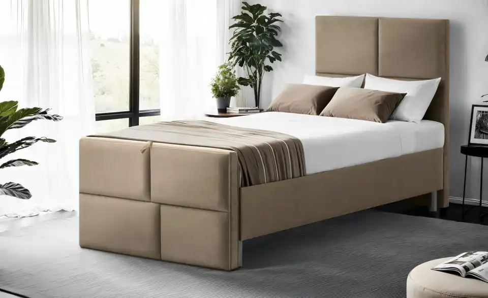 - Lieferumfang / mitgeliefertes ZubehörBeiges Polsterbett mit Bettkasten und Fußteil 90x200 cm