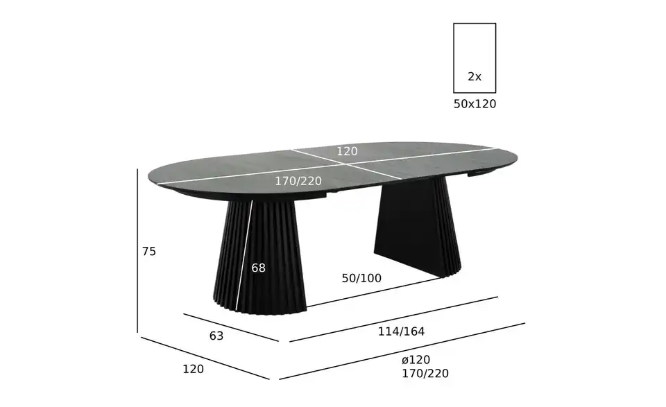- Mehr zu Ausstattung / FunktionAusziehbar (2 Ausziehplatten im Lieferumfang enthalten). Der Tisch kann entweder mit einer Platte auf 170 cm oder mit zwei Platten auf 220 cm verlängert werden. Jede Ausziehplatte ist 50 cm breit.