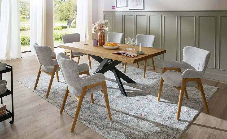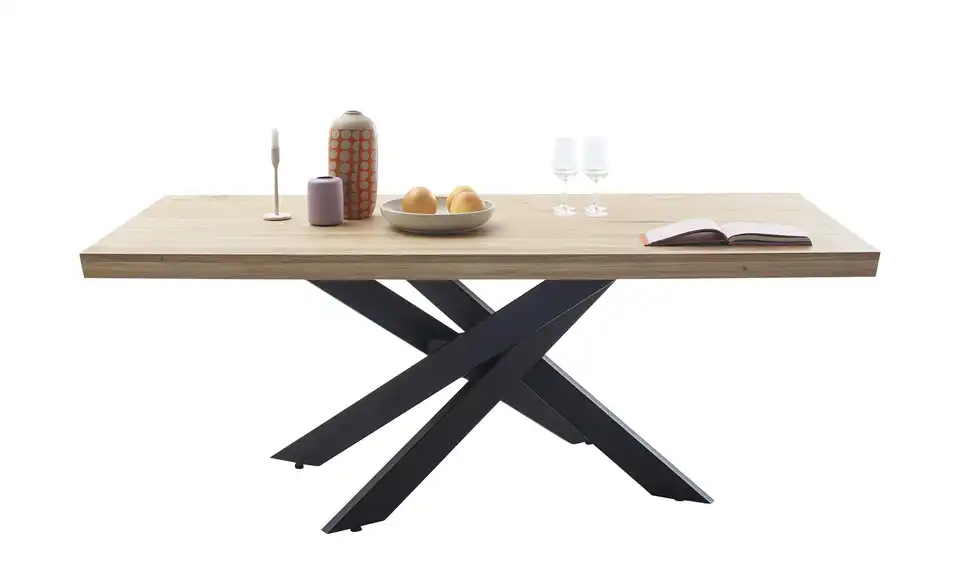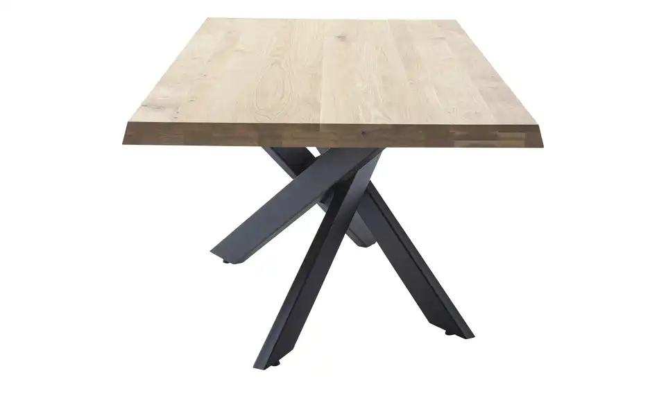 - Mehr zu MaterialTischplatte aus Massivholz in Wildeiche geölt mit durchgehender LamelleGestell Metall Schwarz pulverbeschichtet