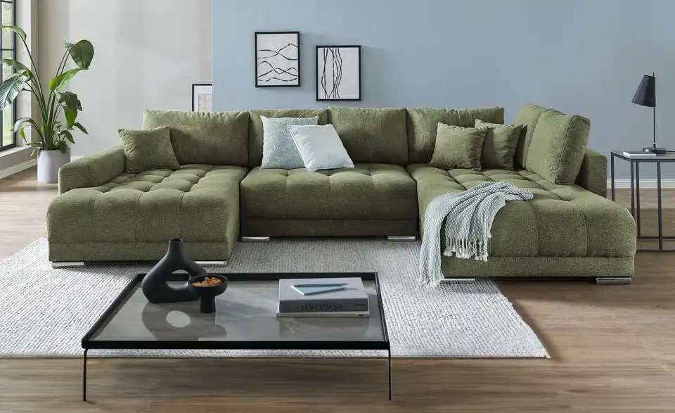 Richtig viel Platz für Freunde und Familie: Diese Wohnlandschaft überzeugt mit zwei einladenden Ottomanen und einer praktischen Schlaffunktion. Sitzen Sie zur Familienfeier bequem zusammen oder genießen Sie in großer Runde einen Filmeabend mit Freunden. Platz gibt es hier genug. Und wenn es doch etwas länger wird, können Sie mit nur wenigen Griffen den Mittelteil umklappen und zu einer Liegefläche umfunktionieren. Dann finden zwei Übernachtungsgäste problemlos Platz. Das dazugehörige Bettzeug lässt sich außerdem im geräumigen Bettkasten unter der Sitzfläche verstauen.Lieferung & Versand