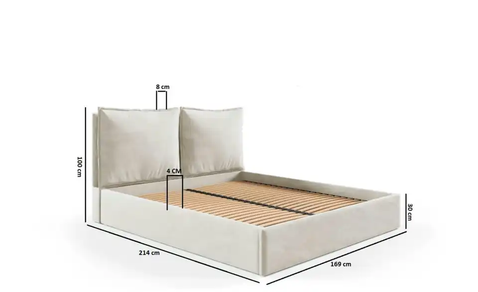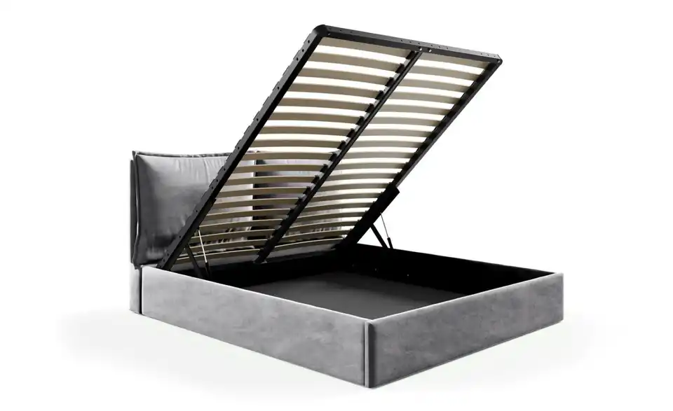- Ausstattung / FunktionBettkastenöffnung am Fußteilinnen liegender Bettkastenmit GasdruckfederKopfteil rundherum bezogen