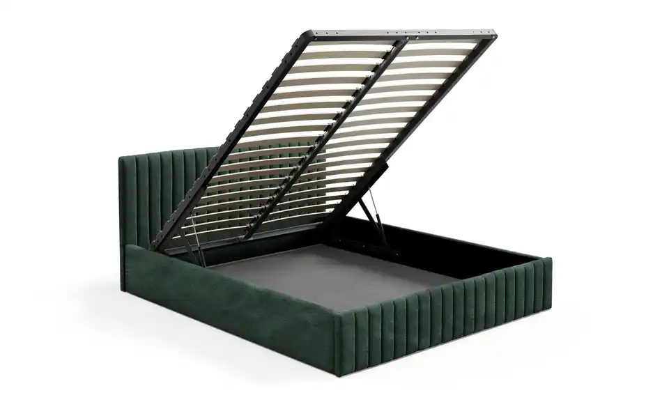- Ausstattung / FunktionBettkastenöffnung am Fußteilinnen liegender Bettkastenmit GasdruckfederKopfteil rundherum bezogen