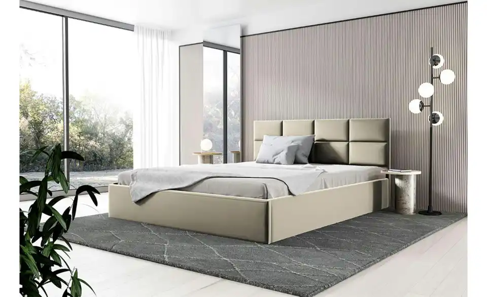 - Ausstattung / FunktionBettkastenöffnung am Fußteilinnen liegender Bettkastenmit GasdruckfederKopfteil rundherum bezogen