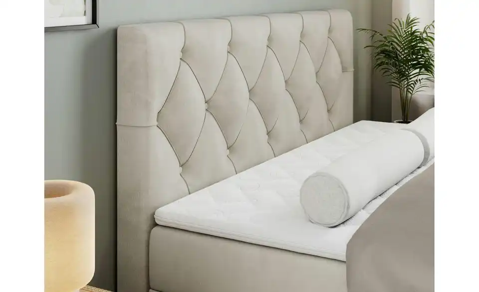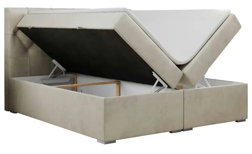- Lieferumfang / mitgeliefertes ZubehörCremefarbenes Polsterbett mit Bettkasten 140x200 cm
