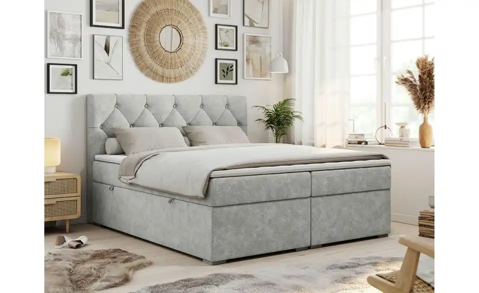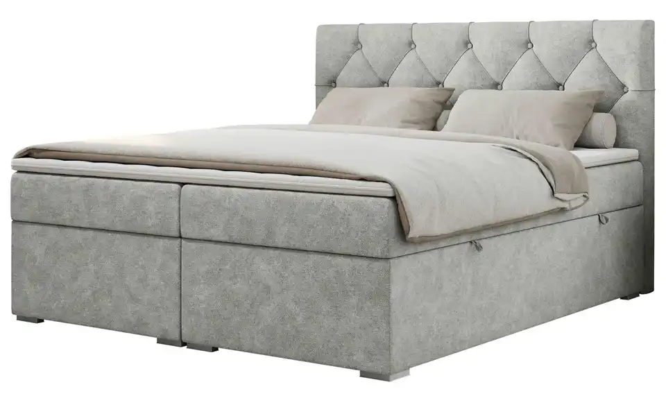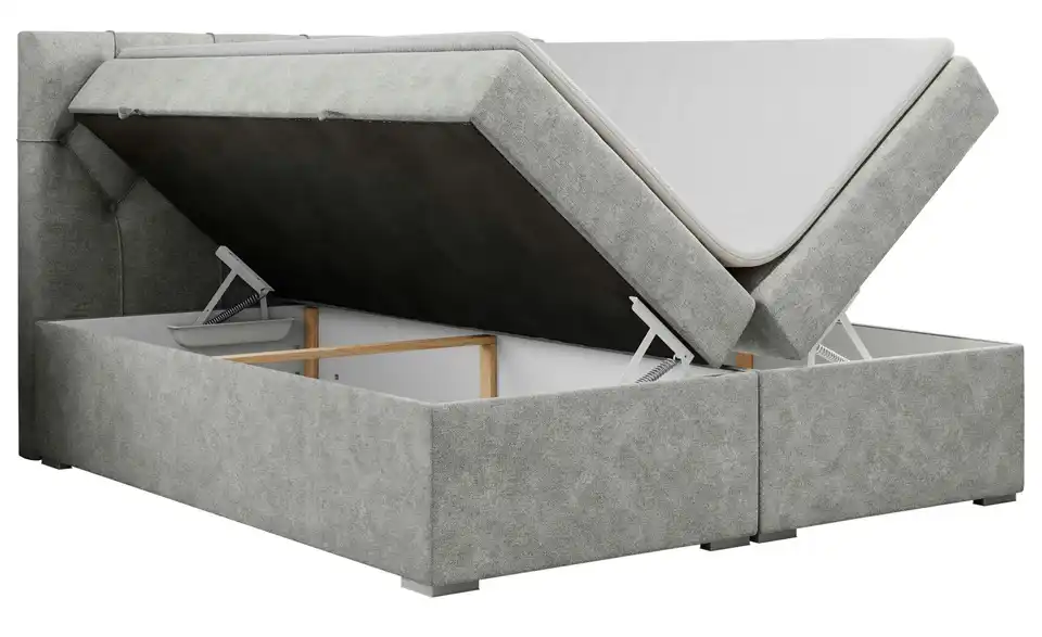 - Lieferumfang / mitgeliefertes ZubehörHellgraues Polsterbett mit Bettkasten 140x200 cm