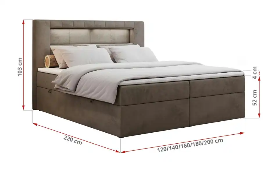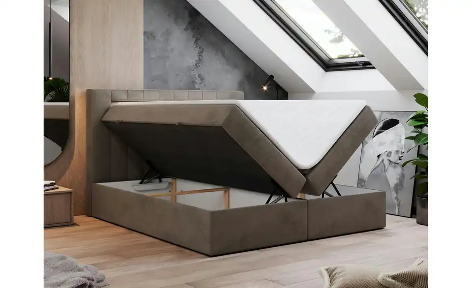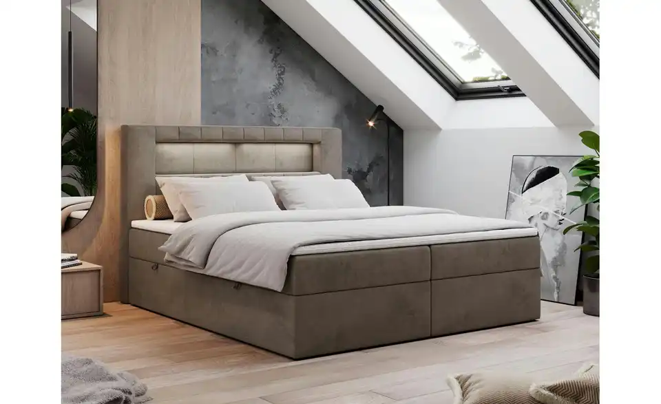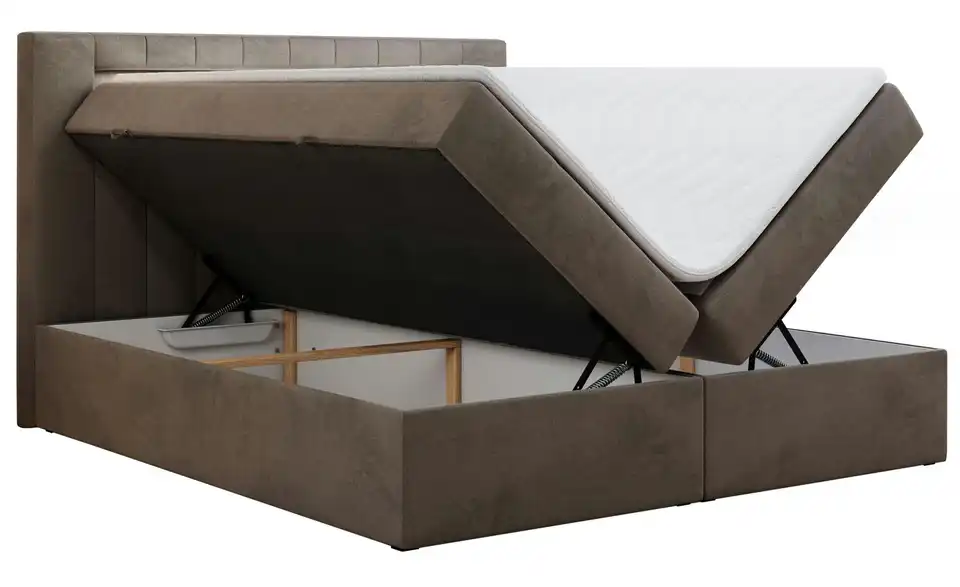 - Lieferumfang / mitgeliefertes ZubehörBronzefarbenes Polsterbett mit Bettkasten 200x200 cm