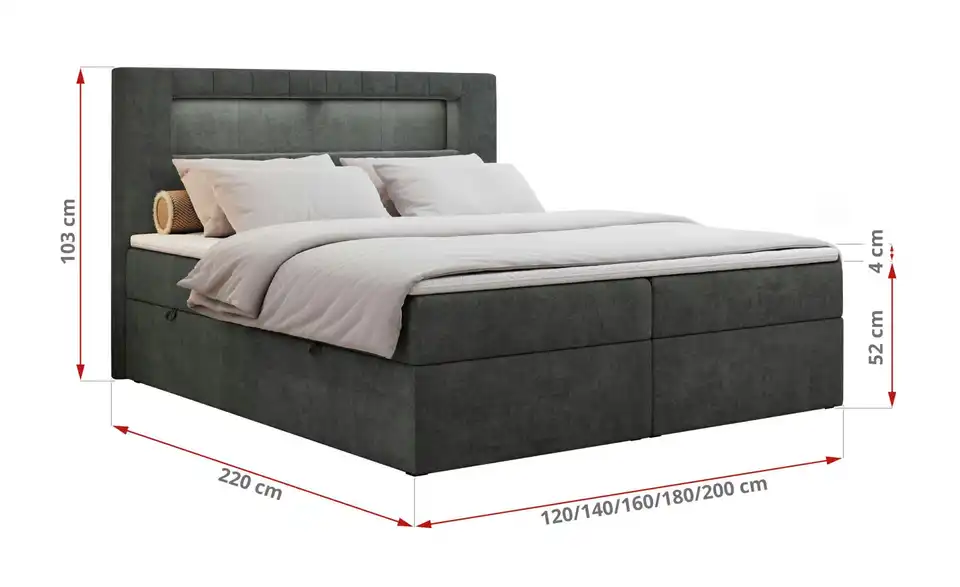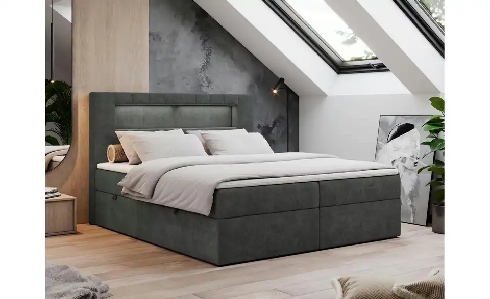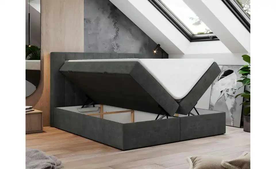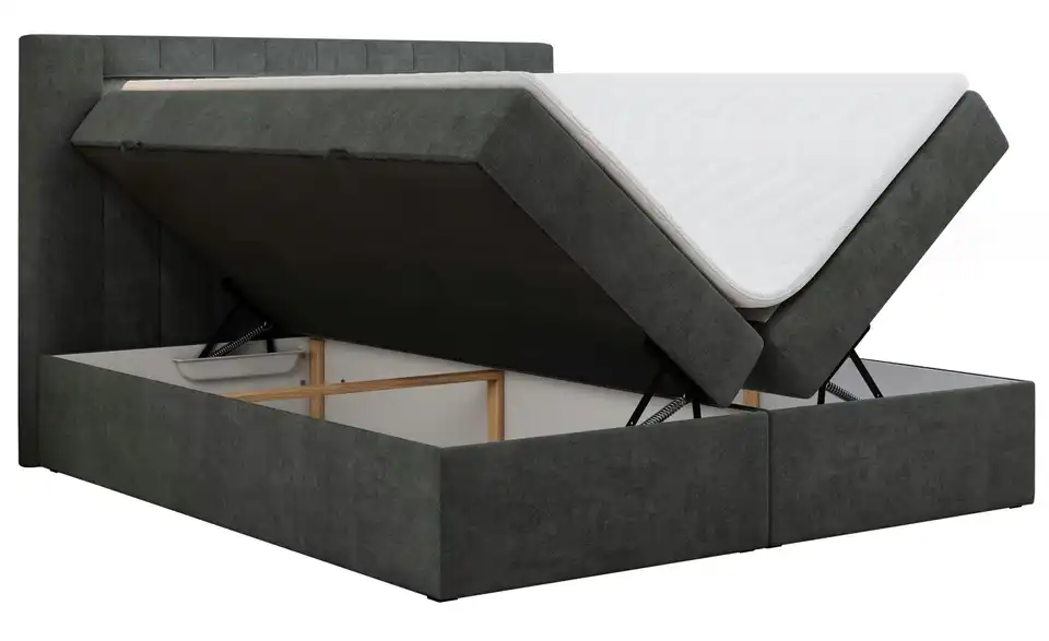 - Lieferumfang / mitgeliefertes ZubehörDunkelgraues Polsterbett mit Bettkasten 200x200 cm