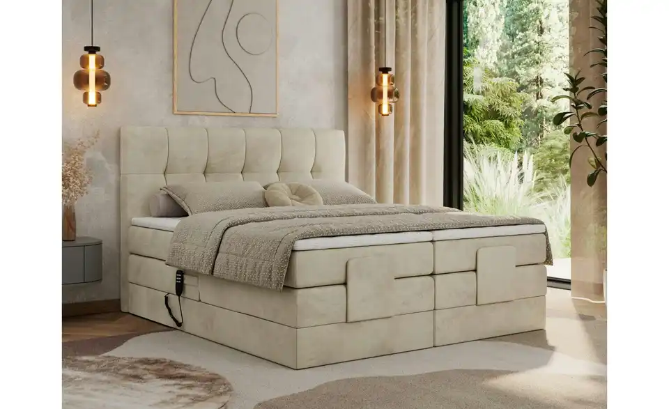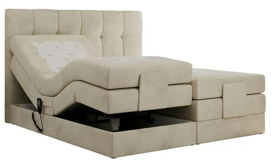 - Lieferumfang / mitgeliefertes ZubehörCremefarbenes Motor-Boxspringbett mit Bettkasten 140x200 cm